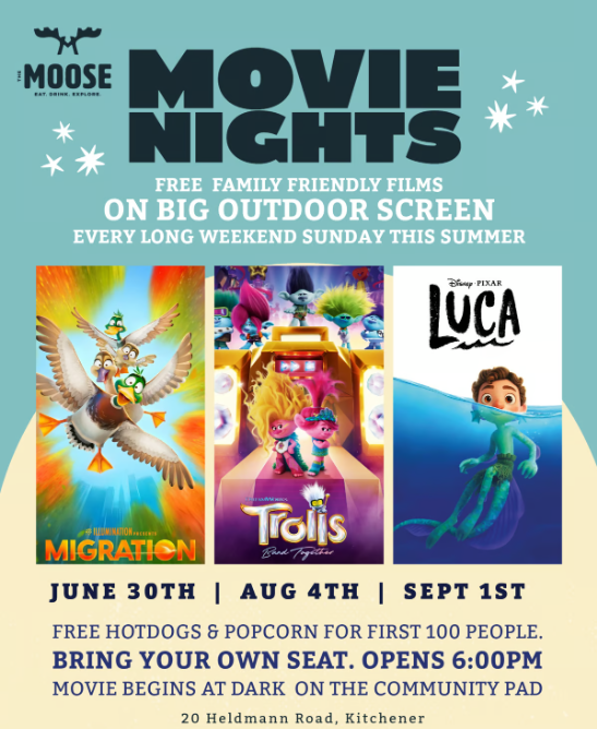 June 30th The Moose is hosting their first Movie Night outside on the Moose Community Pad! Bring your camp chairs and fleeces, they’ll provide the show and the snacks!