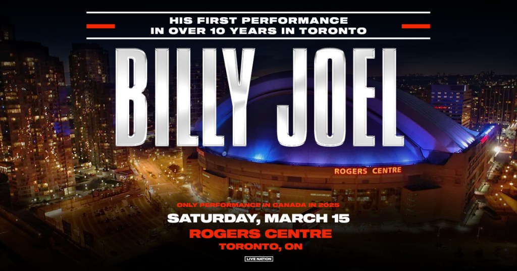 BILLY JOEL at Rogers Centre Where Rogers Centre, 1 Blue Jays Way, Toronto, ON Map When Mar 15/25 06:00 PM - Mar 15/25 11:00 PM Age All BILLY JOEL will be performing live on March 15, 2025 at Rogers Centre in Toronto! Tickets go on sale Friday, October 25, 2024 at 10am.