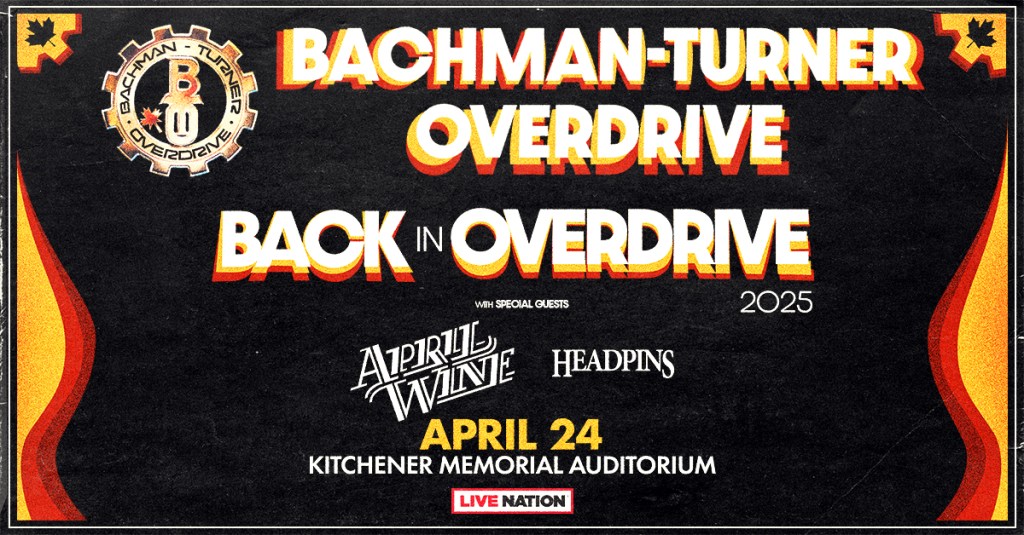 Bachman–Turner Overdrive with April Wine and Headpins at The Aud Where Kitchener Memorial Auditorium, 400 East Avenue, Kitchener Map When Apr 24/25 06:45 PM - Apr 24/25 11:00 PM Age All Website https://kwtickets.evenue.net/cgi-bin/ncommerce3/SEGetEventList?groupCode=BTO&linkID=cits&shopperContext=&caller=&appCode= Bachman–Turner Overdrive with April Wine and Headpins will be performing live on Thursday, April 24, 2025 at The Aud! On Sale: Friday, November 8, 2024 at 10am CLICK HERE to buy your tickets!