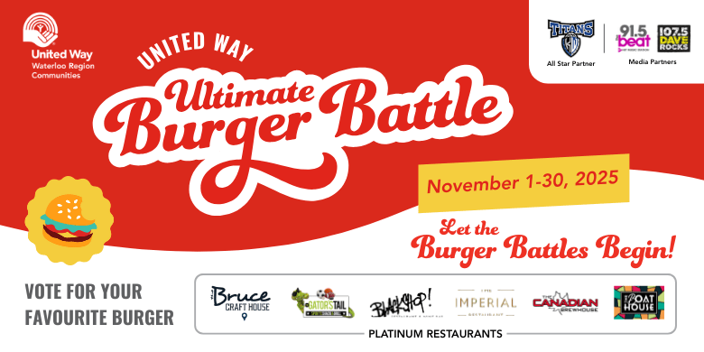 Join us on Thursday, November 6th (6pm–9pm) for the Ultimate Burger Battle Burger Crawl — a four-stop slider adventure through some of Waterloo Region’s best restaurants! Participants will sample signature burgers competing for the title of Top Ultimate Burger Champion. Enjoy an unforgettable night of flavour and fun, and make a lasting impact right here at home through United Way Waterloo Region.