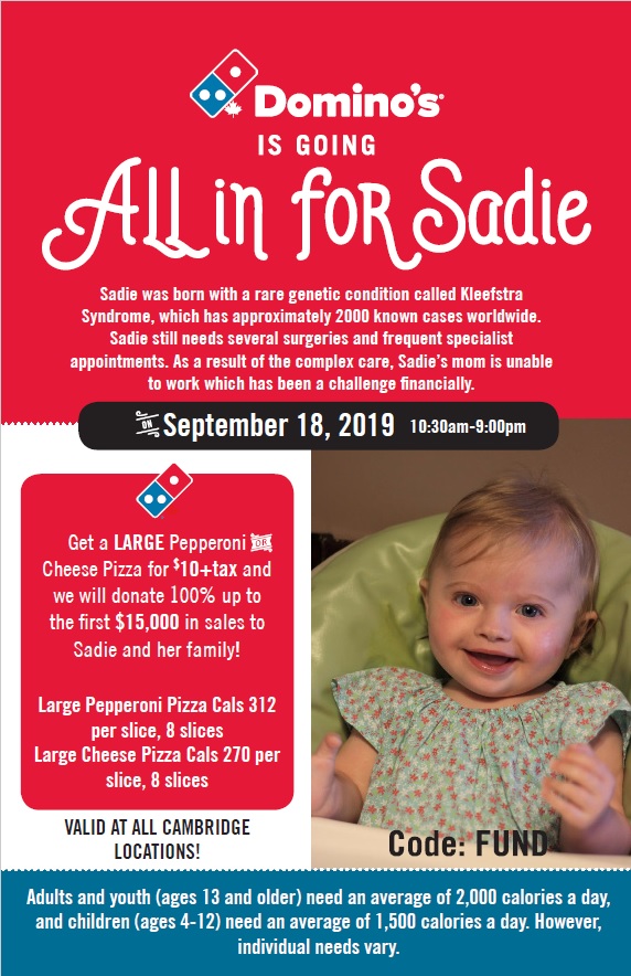 All in for Sadie Where All Cambridge Dominos Locations Map When Sep 18/19 12:00 AM - Sep 18/19 12:00 AM Age All Help a local family on September 18th raise funds for their child!