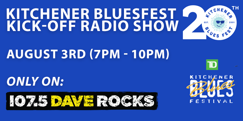 Listen to 107.5 Dave Rocks on Wednesday August 3rd from 7pm – 10pm as Darryl Law hosts a Kitchener Blues Fest Kick-Off show with special guests from KBF!