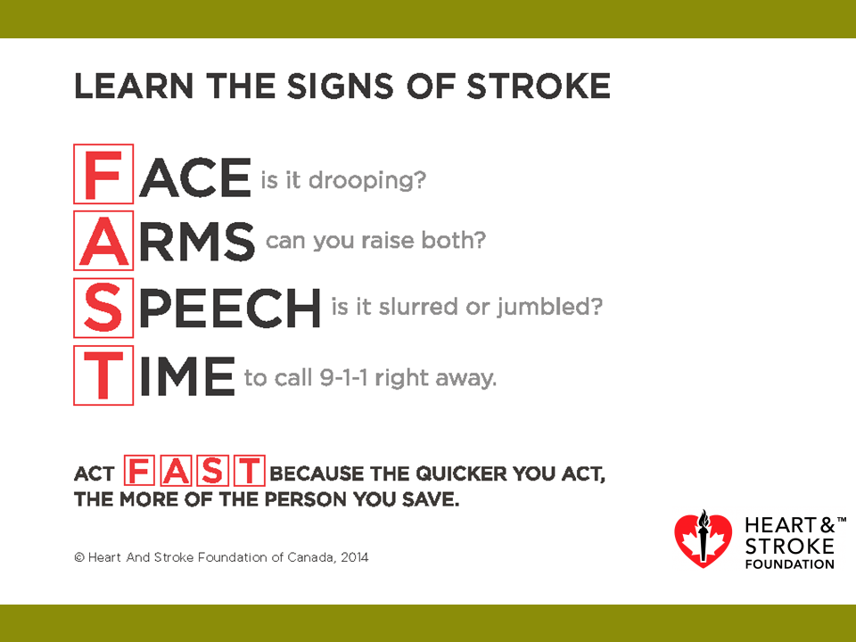 June is Stroke Awareness Month. Our friends at Heart and Stroke Foundation want to remind you of what to look for when recognizing the signs of a stroke: