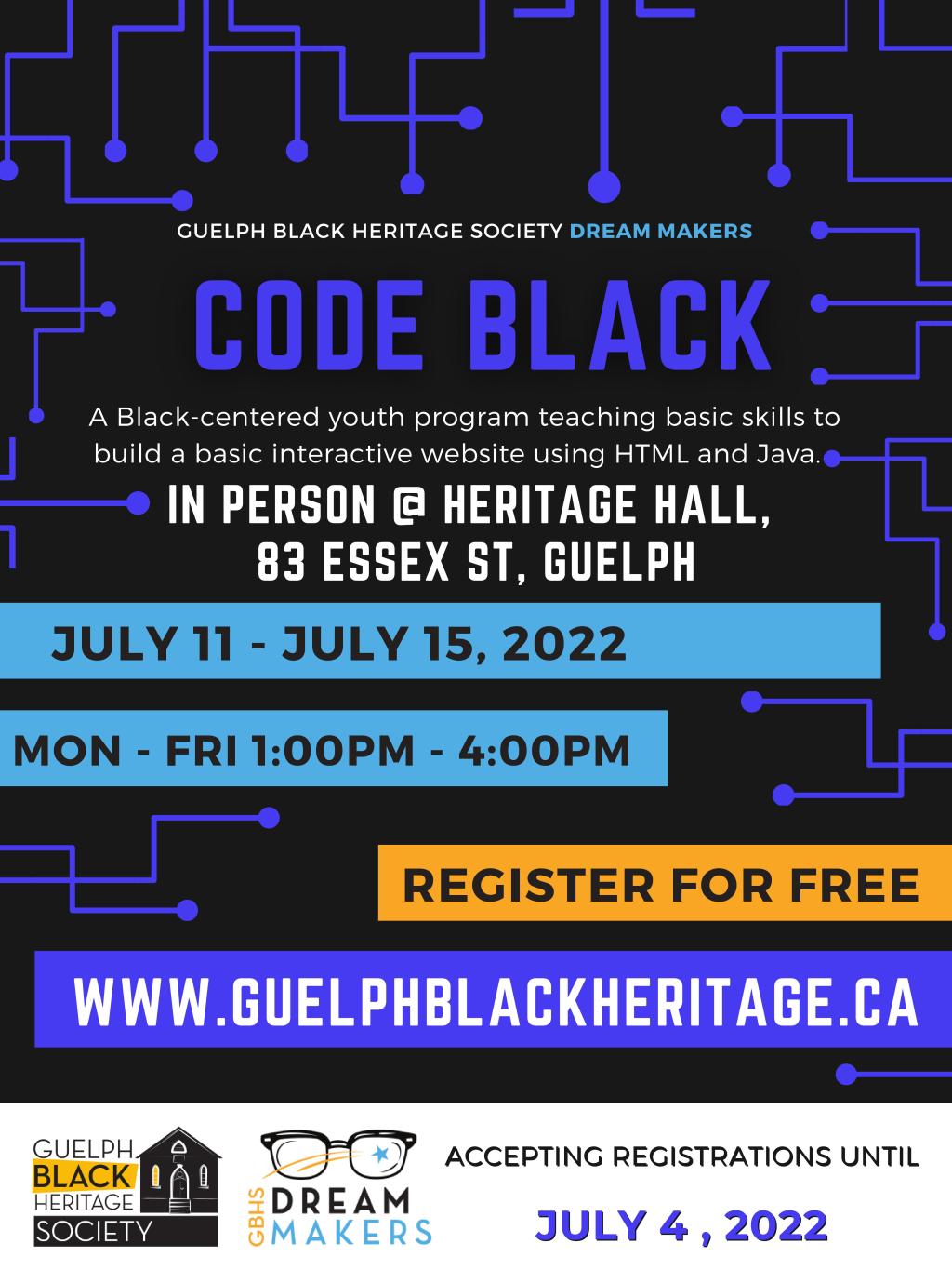 Dream Makers present the Code Black Summer Camp. The program is geared to students between Grade 7 and University, and the program is free of charge. The program sessions are happening on the week of July 11th-15th from 1-4p.