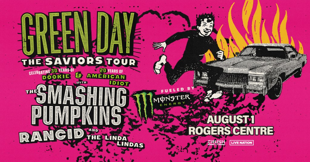 November 2, 2023 (Los Angeles, CA) – Global rock superstars Green Day – Billie Joe Armstrong, Mike Dirnt and Tré Cool – have officially shared details on their massive 2024 global stadium tour with support from with the illustrious rock luminaries The Smashing Pumpkins, Rancid, and The Linda Lindas in North America and Nothing But Thieves, The Hives, Donots, The Interrupters and Maid of Ace in the UK/EU. The Saviors Tour, fueled by Monster Energy, kicks off with the European run on 30 May in Monte De Gozo, Spain and travels through France, Germany and Italy, before reaching the UK, including a huge London show at the legendary Wembley Stadium on 29 June. The North American run, produced by Live Nation, begins shortly after on July 29 at Nationals Park in Washington, DC and makes 27 stops across North America in cities such as Toronto, ON; New York, NY; Chicago, IL; Atlanta, GA; Nashville, TN; Los Angeles, CA; Phoenix, AZ; San Francisco, CA and many more before wrapping up in San Diego, CA at Petco Park on September 28.